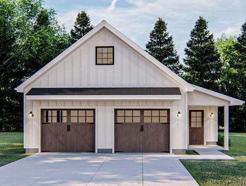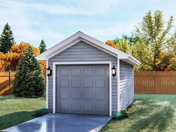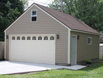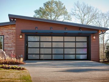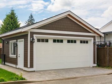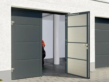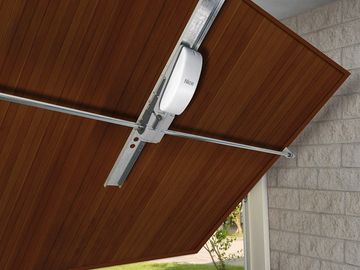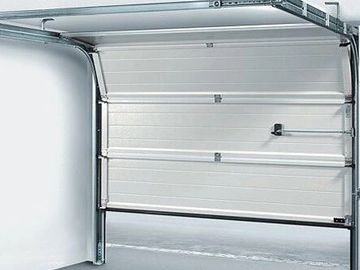 Garage door that has a spring mechanism at the top lifting the door panel at the side and forming a canopy when open as a third of the door sticks out.